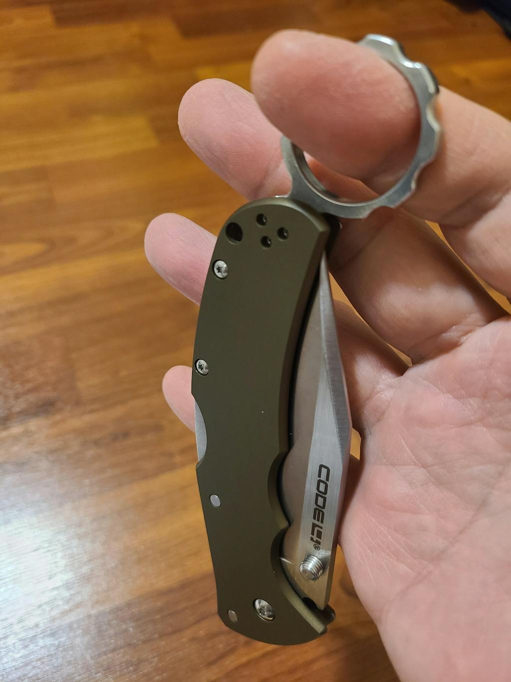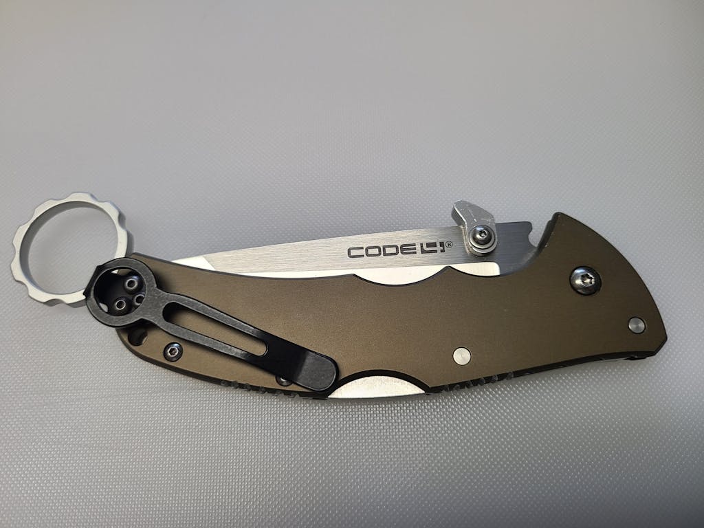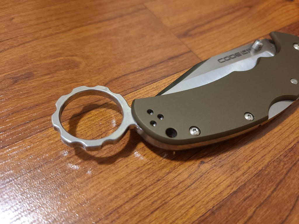 Code 4 Karambit Ring. CNC machined from 6061 aluminum. Tumbled is bare aluminum that is tumbled and black is anodized. As always, Made in the USA, by Snaggletooth Tactical LLC.